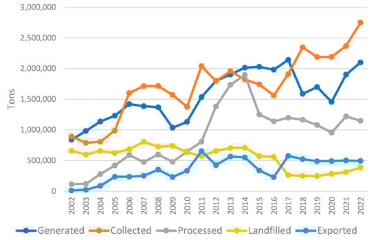 Figure 4 summarizes data on nonhazardous municipal waste management from 2002 to 2021, household-generated CDW constituted a significant proportion of total municipal waste in Latvia.