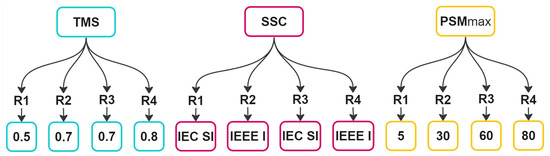 Codification of candidate solutions is a key aspect when implementing metaheuristic optimization techniques. In this case, every DOCR features the ability to modify three parameters in their settings: the , the operating curve () and the . Figure 1 illustrates the representation of a candidate solution for a system containing four relays. Each relay is associated with a set of three values, representing the three adjustable parameters, resulting in a candidate solution vector with a length of three times the number of relays of the system under study. The configuration for relay 1 would be as follows: set the to 0.5, employ an curve, and establish a maximum of 5; specific adjustments for the remaining relays are also depicted in a similar way.