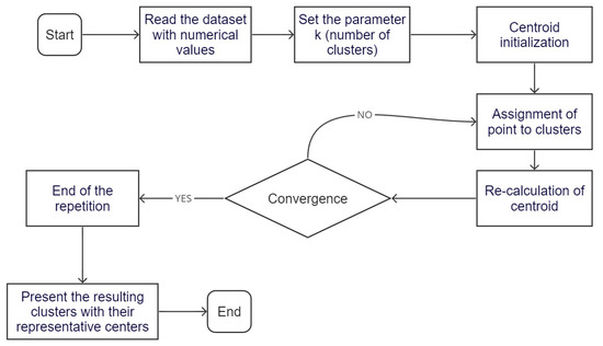 In order to measure the distance between two individual objects and determine which are more similar, the K-means algorithm uses distance functions. Within these functions, the Euclidean distance is one of the most commonly used, which is a measure of the smallest distance between two points, as shown in Equation (11). Figure 3 presents a flowchart illustrating the steps followed by the K-means algorithm for cluster classification.