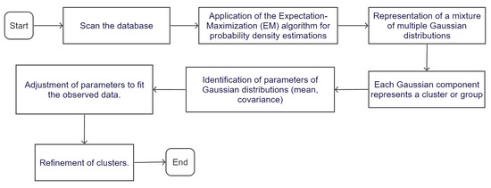 where K represents the number of components in the mixture model, and is known as the mixing coefficient, which provides an estimate of the density of each Gaussian component. The Gaussian density, represented by , is referred to as the component of the mixture model. Each component k is described by a Gaussian distribution with mean , covariance and mixing coefficient [44]. The flowchart of the Gaussian mixtures algorithm is illustrated in Figure 5.