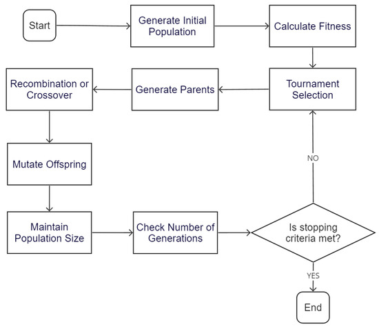Genetic algorithms are optimization techniques inspired by the principle of natural selection. A GA emulates the process of natural selection by evolving a population of potential solutions through processes of selection, crossover, and mutation. Figure 6 illustrates the flowchart of the implemented GA.