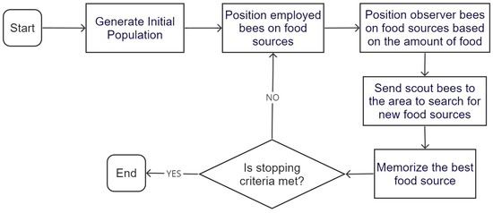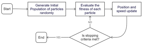 PSO is a stochastic method used to tackle combinatorial problems by employing a group of candidate solutions or particles that navigate through a search space based on rules governing their position and speed. Every particle’s trajectory is shaped by its own locally known best position and is directed towards the overall best positions discovered in the entire search space. The implementation steps of PSO are depicted in Figure 7. This approach starts by randomly generating potential solutions placed within the search space. Each potential solution includes two vectors: one defining its position and the other representing its velocity. These vectors are then adjusted for each particle in each iteration, considering both its own best historical information and the best global historical information available.