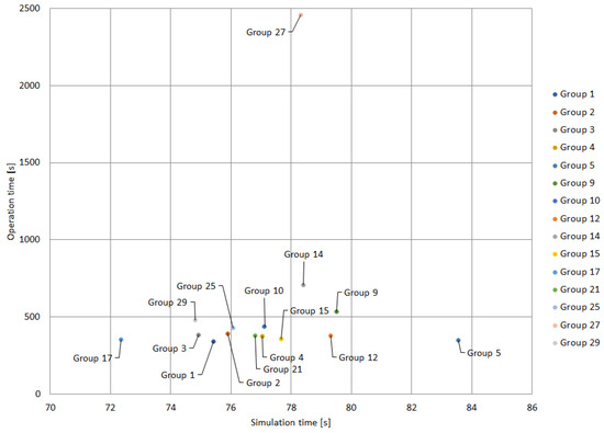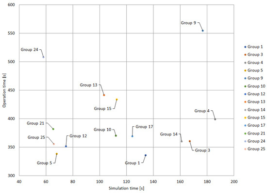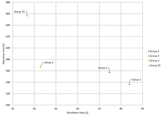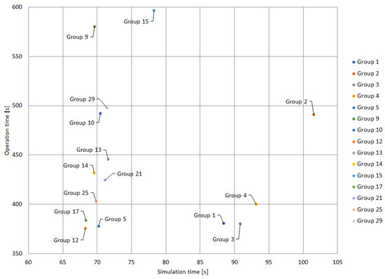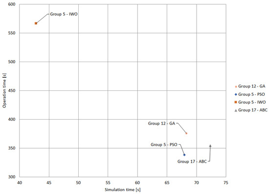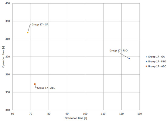 Group 17 of the ABC algorithm has the second best operation time (354.58 s) and the worst simulation time (72.34 s). Finally, Group 12 of the GA algorithm has the third best operation time, with a total of 375.45 s, and the third best simulation time, with 68.28 s.