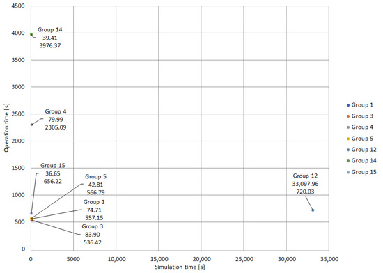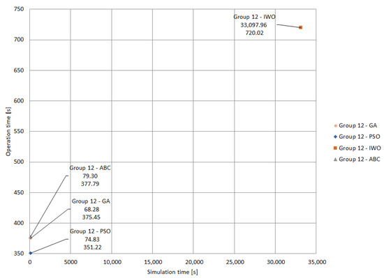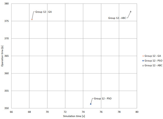 Figure 17 shows a zoom in of Figure 16, providing a more accurate visualization of the results of Group 12 with GA, PSO and ABC. It can be seen that GA has the best simulation time with 68.28 s; however, it presents the second-best operation time, with a total of 375.45 s. In contrast, the PSO Algorithm stands out with the best operation time for this group, with 351.22 s, although it has the second-best simulation time (74.83 s). On the other hand, ABC has the longest simulation and operation times.