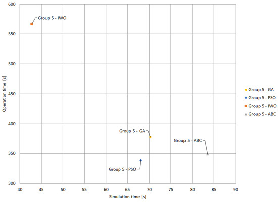 PSO and IWO obtained the best operation and simulation times with Group 5; consequently, the results of all techniques in this group were compared in Figure 18. In this case, the results obtained with PSO present the best operation time (338.37 s), along with the second-best simulation time (67.93 s). On the other hand, the IWO algorithm presents the shortest simulation time, with 42.80 s, although with the worst operation time, located at 566.78 s. The ABC algorithm stands out with the second-best operation time of 349.33 s, and the third-best simulation time, of 83.53 s. Finally, the GA algorithm recorded operation and simulation times of 377.73 and 70.20 s, respectively.