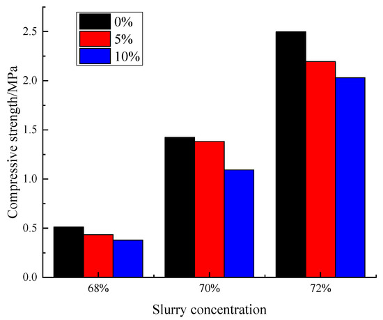 Figure 2 also indicates that the compressive strength significantly increases with an increasing slurry concentration. When the paraffin wax percentage is 0%, 5% and 10%, respectively, and the slurry concentration is 68%, the compressive strength is 0.508 MPa, 0.434 MPa and 0.378 MPa, respectively. When the slurry concentration is increased to 72%, the compressive strength is 2.502 MPa, 2.198 MPa and 2.034 MPa, respectively, increasing by 3.93, 4.06- and 4.38-times year-on-year. The reason is analyzed as follows: with the increase of slurry concentration, the internal structure of the backfill specimen becomes more compact, intermolecular aggregation is enhanced and the needed force for destroying intermolecular force gradually increases, so the compressive strength increases. The data analysis shows that for the same increase in slurry concentration, the larger the paraffin percentage, the greater the increased degree of compressive strength.