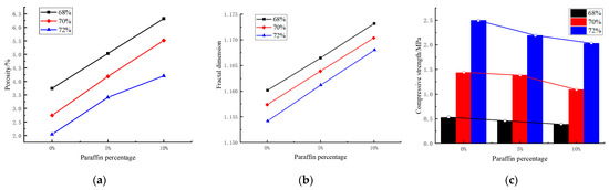 Porosity, fractal dimension and compressive strength for different paraffin percentages. (a) Porosity; (b) fractal dimension; (c) compressive strength.
