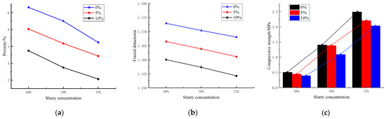 Porosity, fractal dimension and compressive strength for different slurry concentrations. (a) Porosity; (b) fractal dimension; (c) compressive strength.