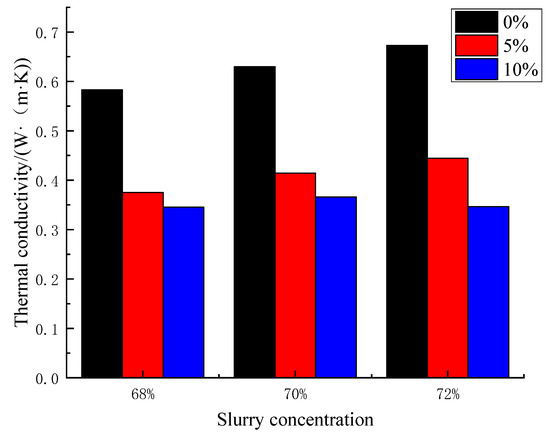 Figure 5 also indicates that the thermal conductivity slightly increases with an increasing slurry concentration, but the influence of slurry concentration on thermal conductivity is not obvious for a paraffin percentage of 10%. When the slurry concentration increases from 68% to 72%, the thermal conductivity increases from 0.5833 W/(m·°C) to 0.6716 W/(m·°C) and from 0.3743 W/(m·°C) to 0.4428 W/(m·°C) for a paraffin percentage of 0% and 5%, and it increases by about 15.1% and 18.3% successively. The internal structure of the backfill specimen becomes more compact due to the larger slurry concentration; the compactness and continuity of the microstructure are improved, so the thermal conductivity increases. However, when the paraffin percentage is larger, the porous and loose structure caused by paraffin microcapsules is difficult to improve by the increase of slurry concentration. In addition, the mass of paraffin with low thermal conductivity also increases, so the effect of the increase of slurry concentration on thermal conductivity is not obvious. In response to the study in this article, the addition of paraffin microcapsules resulted in a decrease in the thermal conductivity of the filling material at the same slurry concentration. Zhang et al. [32] used graphite, copper powder, steel slag powder and gasification slag as substitutes for tailings when the addition amount increased to 10%. The slurry concentration was 70%, and the ash to sand ratio was 1:4. The thermal conductivity increased to 1.11 W/(m·K), 0.87 W/(m·K), 0.85 W/(m·K) and 0.83 W/(m·K), with an increase of 60.2%, 25.4%, 22.5% and 19.7%, respectively. Therefore, while meeting the compressive strength conditions, it is still necessary to search for phase-change materials with better thermal conductivity in the future.