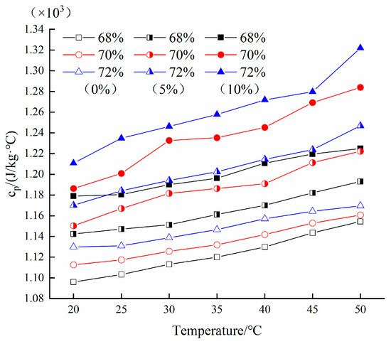 Figure 6 shows the variations of the specific heat capacity at a constant pressure with temperature for different backfill specimens. It indicates that the specific heat capacity gradually increases with rising temperature; the average increment is 67 J/(kg·°C) in the temperature range of 20 °C~50 °C. The figure also shows that the specific heat capacity increases with an increasing paraffin percentage at a certain temperature. At a phase-change temperature of 30 °C, when the paraffin content is 0%, 5% and 10%, and the slurry concentration is 68%, the specific heat capacity is 1.113, respectively, × 103 J/(kg·°C), 1.126 × 103 J/(kg·°C) and 1.138 × 103 J/(kg·°C). When the slurry concentration increases to 72%, the specific heat capacities are 1.190, respectively, × 103 J/(kg·°C), 1.234 × 103 J/(kg·°C) and 1.246 × 103 J/(kg·°C), the greater the year-on-year increase in specific heat capacity. As a phase-change material, paraffin wax has good heat storage performance and large specific heat capacity under constant pressure, so the increase of paraffin wax percentage makes the backfill sample have a large specific heat capacity.