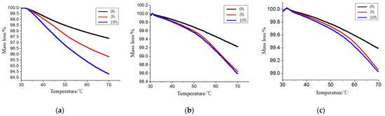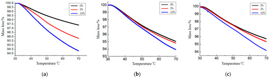 Mass loss for different temperature rise rates (slurry concentration of 68%). (a) Temperature rise rate of 1 °C/min; (b) temperature rise rate of 5 °C/min; (c) temperature rise rate of 10 °C/min.