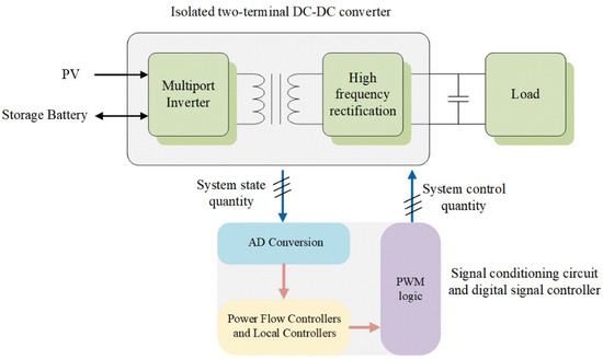 The system structure of the proposed step-up multiport converter is shown in Figure 1 and is composed of three parts: isolated power unit, electric sensor and signal processing part, and digital control center. The proposed system can simultaneously connect low-voltage photovoltaic cells, storage batteries, and loads (this time using the isolated inverter to simulate the grid system) to realize energy exchange between the three energy ports.