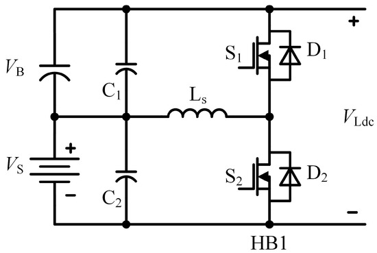 The dual-input buck-boost converter unit is shown in Figure 3. The topology consists of two input sources (the battery and the photovoltaic cell ) and an output (the two ends of the bridge arm HB1), which are merged into the low-voltage side DC bus. By controlling the alternate conduction and shutdown of MOS transistor and MOS transistor , the battery is charged and discharged. In addition, it provides energy for the low-voltage bus bar.