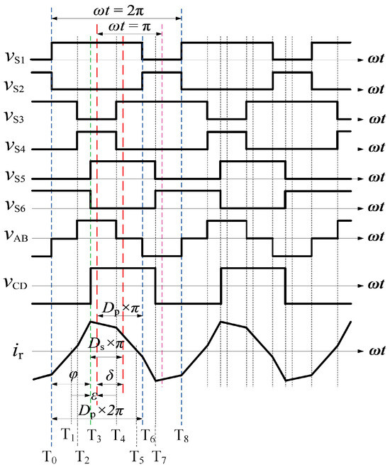 Figure 5 shows the ideal working waveform when the converter is in the power forward transmission mode, and the duty cycle of the primary full bridge is greater than 0.5, where , , , , , and are the voltage waveforms between the gates of , , , , , and , respectively. There is a 180° phase shift between the rising edge of and the rising edge of . The and are the midpoint voltage of the bridge arm of the primary side inverter and the midpoint voltage of the bridge arm of the secondary side half-bridge fully-controlled rectifier. is the current flowing through the transformer, is the duty cycle of and , and is the duty cycle of , where = 0.5. is the center phase shift angle between the high-level midpoint of and the high-level midpoint of . is the shift between the rising edge of and the rising edge of phase angle.