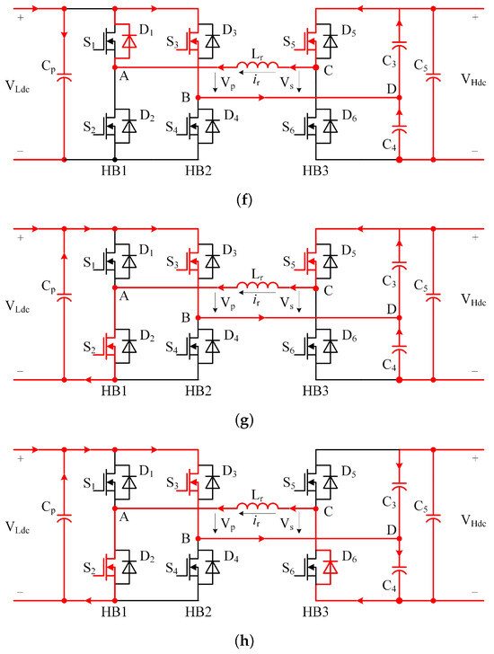 Power forward transfer working mode, the equivalent circuit in each state in one switching cycle when > 0.5. (a) Equivalent circuit of bidirectional DC-DC converter in State 1. (b) Equivalent circuit of bidirectional DC-DC converter in State 2. (c) Equivalent circuit of bidirectional DC-DC converter in State 3. (d) Equivalent circuit of bidirectional DC-DC converter in State 4. (e) Equivalent circuit of bidirectional DC-DC converter in State 5. (f) Equivalent circuit of bidirectional DC-DC converter in State 6. (g) Equivalent circuit of bidirectional DC-DC converter in State 7. (h) Equivalent circuit of bidirectional DC-DC converter in State 8.