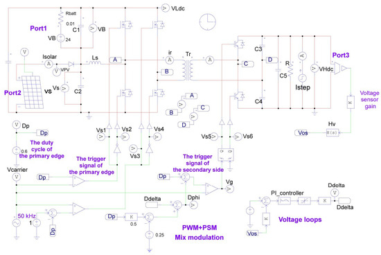 In order to verify the working mode and control strategy of the system, a closed-loop simulation of the step-up multiport converter (MPC) proposed in this paper is carried out in the PISM software (9.14 Professional), and the simulation circuit diagram is shown in Figure 9.