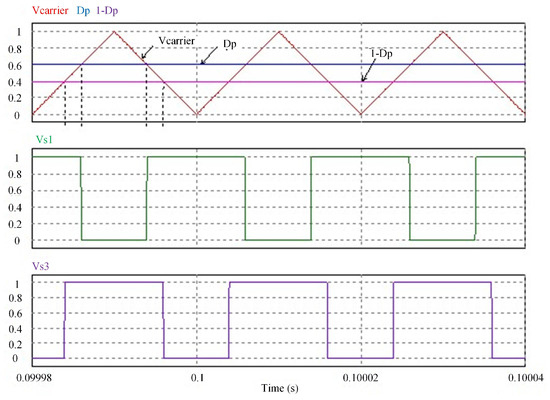 The principle of trigger signal generation of the primary and secondary sides is simulated and verified in PSIM. The primary side duty cycle is given as = 0.6 and = 0.1 ( = 0.2) for simulation, and the waveform generated by the primary trigger signal is shown in Figure 10. The waveform generated by the secondary trigger signal is shown in Figure 11. The simulation results are consistent with the previous analysis and verify the feasibility.
