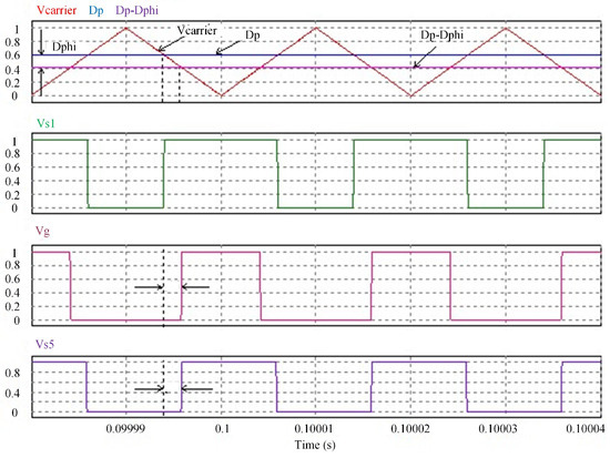 Through the above relationship, the phase shift angle between the rising edge of and the rising edge of vs1 can be calculated according to the current primary side duty cycle , secondary side duty cycle , and the central phase shift angle between the high−level midpoint of vs1 and the high-level midpoint of .