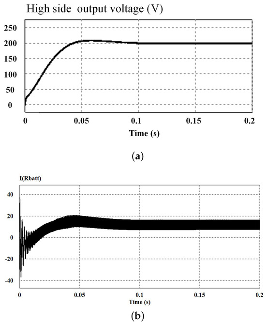 Figure 12 shows the simulated waveform of the output voltage of the high voltage side. As can be seen from the simulation results, the final output voltage is stabilized at 200V and the output voltage on the high side is effectively controlled. The battery current is positive, which proves that the battery is in a discharged state.