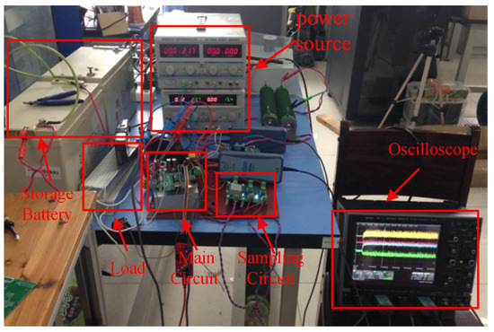 Based on the theoretical analysis and simulation verification result, an experimental prototype was established using the dsPIC33FJ64GS606 the as digital controller. The device is mainly composed of a main circuit, a control circuit, and an auxiliary power circuit. The control circuit includes a chip and its peripheral circuits, a sampling circuit, and a driving circuit. The experimental platform is shown in Figure 13. Table 2 shows the circuit experimental parameters.