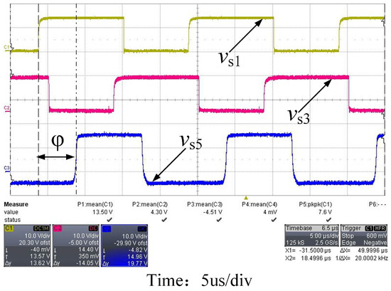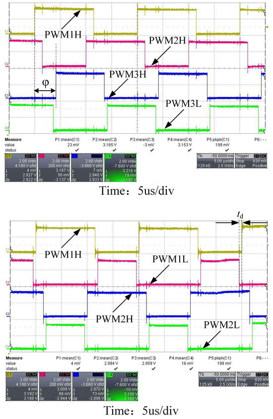 Figure 16 shows the corresponding gate-to-source trigger signal waveform (10 V/div for all three channels) after the PWM signal output by the PWM module is passed through the drive circuit.The figure shows the waveforms of the gate trigger voltages , and obtained by PWM1H, PWM2H, and PWM3H after the corresponding drive circuits, and the phase shift angle between the rising edges of the waveforms of and is .