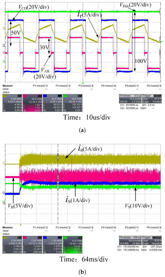 From the steady-state experimental results shown in Figure 15a, the HVS output voltage of 100 V has been successfully controlled. From the waveforms of voltage and voltage , it can be seen that the high-level center of is ahead of the high−level midpoint of , that is, the phase of the primary side is ahead of the secondary side, the primary side of the transformer transmits power to the secondary side, and the system is in the power forward transmission state.