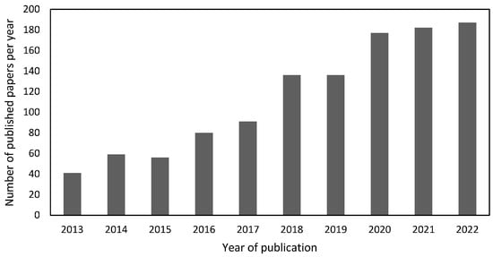During the last decade, among the most investigated PV systems, bifacial solar technology has played a major role thanks to its readiness level and the rapid increase in the installation market share over the last few years. Indeed, as reported by the International Technology Roadmap for Photovoltaic, a constant rise is foreseen in the market share of PV systems for bifacial solar cells from 20% in the year 2020 up to 70% in 2030. The academic community has also been focusing its attention on bifacial solar cells, as can be seen from the research trend over the last decade reported in Figure 1. From 2013 up to 2022, the yearly number of published papers found in the Scopus database on bifacial solar systems increased from 41 to 187, marking the academic interest in the technology.