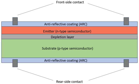 If on one hand second- and third-generation PV systems still struggle to achieve a significant market share, on the other hand, the recently developed bifacial PV is making its way to becoming the most used solar system in the near future. One of the major advantages that contributed to the fast and widespread development of this system is that it adopts the same technology used in monofacial silicon crystalline cells, with the main difference being replacing the opaque rear surface with a transparent one in order to allow light to hit the cell’s back surface. In this way, energy production can be enhanced thanks to the possibility of exploiting the reflected and diffuse light that hits the rear side of the panel. A schematic cross-section of a p-type bifacial solar cell is presented in Figure 2. To realize the photovoltaic panel, the solar cell is further encapsulated and placed between two sheets of solar glass.