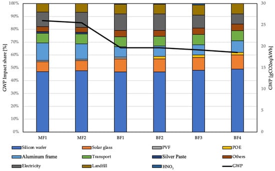 The determination of the life cycle inventory (LCI) was investigated through the collection of data directly from different China PV manufacturers, using questionnaires. By gathering information from the product warranties, lifetime was considered to be equal to 25 years for monofacial panels and 30 years for bifacials. The inventory analysis shows the following variation in material consumption, when upgrading from 1 kWp monofacial PERC to 1 kWp bifacial PERC panels: a +25% increase for solar glass, a reduction in the range of 33–43% for aluminium, a −67% decrease for the metallization paste, and a decrease of between 54% and 74% for tap water. Figure 4 presents, for each technology, the total GWP in terms of gCO2eq/kWh and the relative contribution of each material and process production.