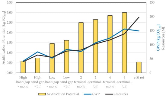 Ahangharnejhad et al. [36] studied the energy and environmental behaviour of different single- and multi-junction monofacial and bifacial perovskite solar cells according to different albedo conditions. The proposed technologies were high and low bandgap single-junction bifacial cells and two or four terminals with multi-junction configurations. The results were then compared to those for traditional single-junction crystalline silicon panels. The functional unit was 1 m2 of active area, a cradle-to-end-of-use was defined as system boundary with an expected lifetime of 25 years. The results show worse performance when using bifacial hetero-junction solar cells in comparison to standard c-Si and perovskite single-junction technologies. In terms of energy gain, among the four technologies considered, bifaciality allowed an increase in energy production of between 4% and 18% in comparison to that of their monofacial counterpart. As reported in Figure 5, when upgrading from a monofacial to a bifacial structure, the environmental impacts increase in the range of 20–60%, for each square metre of surface area produced. This condition is mainly due to a higher amount of solar glass, anti-reflective coating and the contacting layers. The authors also found an increase in energy yield of up to 61% for different configurations of bifacial silicon tandem perovskite solar cells with snow ground conditions, when changing the installation site from Toledo (Ohio) to Golden (Colorado). The reference values of the annual average global horizontal irradiance were, respectively, 5.5 kWh/m2 and 4 kWh/m2. The GWP of perovskite bifacial PV is reported to be in the range of 11–15 gCO2eq/kWh.