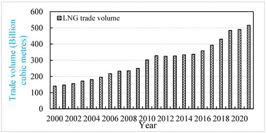 As the cleanest fossil fuel, liquefied natural gas is crucial in supplying the world’s energy and contributing to net-zero emission targets. With increasing environmental awareness, the world’s demand for LNG has grown dramatically, and the LNG trade market has become increasingly dynamic. Figure 1 describes the global LNG trade trend from 2000 to 2021. Over the past 20 years, the global LNG trade scale has exhibited a consistent upward trend, rising from 14.048 billion cubic meters in 2000 to 51.623 billion cubic meters in 2021, representing a remarkable 3.6-fold expansion. As a result, LNG trade has gained an increasingly significant position in the global energy trade market.