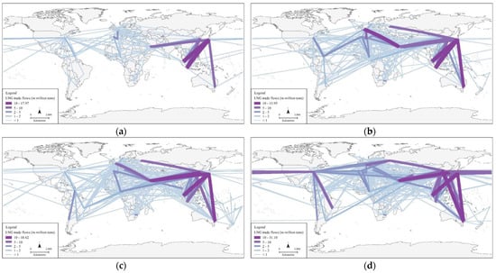 Evolution of the global LNG trade patterns. (a) 2000; (b) 2010; (c) 2015; (d) 2021. (Data from: World Integrated Trade Solution (WITS) database).