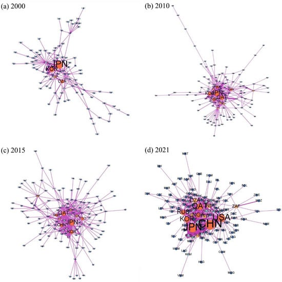 From the perspective of trade flows, LNG trade links among countries worldwide have increased steadily over time, the overall density of the network has been rising, the expansion trend of the network at all levels is obvious, and the evolution of the network has gradually accelerated. The regionalization of the global natural gas trade was obvious in the early days. Pipeline natural gas, mainly supplied within the region, was still the main form of international trade in natural gas. The scale of the LNG trade network was relatively small. In 2000, only two sets of node pairs, Japan–Indonesia and Japan–Malaysia, belonged to the first tier, with a trade volume of more than 10 million tons. As a large natural gas importing country, Japan had a trade volume in that year which accounted for 31.60% of the global total, and it has a pivotal position in the trade network. Indonesia was the largest LNG exporter in 2000, followed by Malaysia, and the above two (Indonesia 21.26%, Malaysia 12.97%), together with Australia (8.60%) and Qatar (6.90%), were responsible for almost half of Japan’s LNG imports. At that stage, large-scale LNG trade was dominated by developed countries in Europe and the Asia–Pacific region, with little participation from North American and African countries, most of which traded in volumes of less than 2 million tons. Subsequently, LNG has been increasingly favored by energy trading countries due to its commodity characteristics, such as diversified trade forms, cheap long-distance transportation, and flexible transportation routes. At the same time, the accelerated process of economic globalization has pushed LNG from a regional commodity to a global bulk commodity. Specifically, in 2010, there were 136 countries/regions and 321 node pairs in the global LNG trade network, with the number of node pairs in each of the five levels of the network doubling and the overall scale of the trade network expanding exponentially, with obvious hierarchical differentiation, showing more complex network connection characteristics. The supply and demand contradiction in the global LNG trade market has existed for a long time, and the energy competition has intensified. In 2015, the node pairs in the trade network grew to 364 groups, and the node pairs with a trade size of more than 10 million tons stayed at four pairs. The newly added trade links mainly occurred between trading countries with a trade volume of less than 5 million tons, and the scale of the middle- and low-tier trade network has been further developed. By 2021, China–Australia overtook Japan–Australia as the node pair with the largest trade volume in the network. Japan–Australia, South Korea–Qatar, and Japan–Malaysia are the other three node pairs with more than 10 million tons of trade volumes. Japan and South Korea have long imported large quantities of LNG, making them the most active global natural gas market importers.