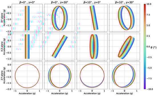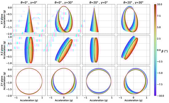 The sensitivity of these measurements to variations of the different parameters is represented in Figure 2, Figure 3 and Figure 4, where two out of the nacelle tilt, blade cone and blade pitch angles have been fixed and the remaining one varied within a certain range. It can be seen that the accelerations time series, when any combination of 2 channels is considered, describe an ellipsis that may be written, in its most general form, as: