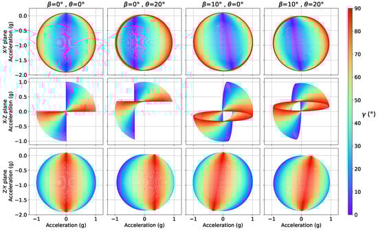 Relation between different blades’ measurements over a full revolution as a function of the nacelle tilt (), considering different combinations of the blades’ pre-cone () and pitch () angles.