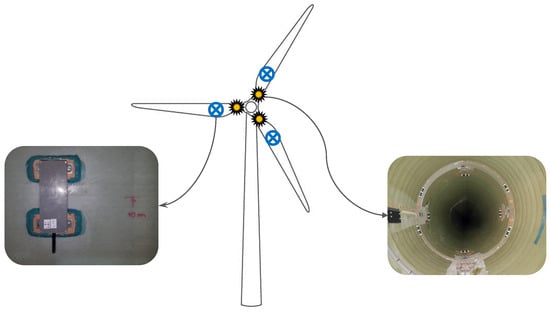 The data that will be used in this work was obtained from the extensive monitoring campaign being conducted in the context of the WindFarmSHM project in a windfarm located in Tocha, Portugal. This windfarm included 5 VESTAS V100 wind turbines, labelled from WT1 to WT5, with a rated power of 1.8 MW. The experimental campaign, described in detail in [] for which 10-min averaged SCADA data was also available, includes accelerometers and strain gauges installed in both the tower and the blades of WT1 and WT5 (WT1 with the 3 blades instrumented and WT5 with two blades instrumented), namely a set of fibre optic strain gauges at each blade’s root and the MEMS accelerometers described above placed at roughly 10m from the root, as represented in Figure 5. The methodology that will be presented in the following section will rely only on the latter.