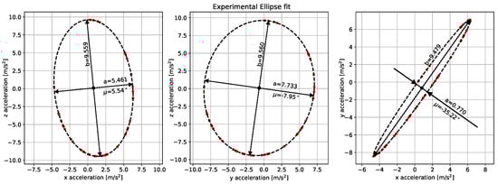 where S is the sensitivity and O the offset that map the real acceleration to the measured value . While it may be assumed that for well calibrated devices, it might not be that (as discussed by [], it is common the existence of small variations of the sensor offset over time). From the equations above, it can be seen that the offset condition impacts the coordinates of the ellipsis centre, while the sensitivity impacts both the centre and the ellipsis parameters. Since only the errors on the sensitivity are being neglected, it can be seen that although the centre point coordinates could theoretically be used to estimate the needed parameters, these are not reliable, so only differential measurements should be used. Having set this clear, it can be noted that Equation (17) can readily be used to provide a direct estimate for since: