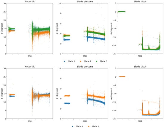 Rotor tilt, blade precone and pitch angle for different values of the rotor angular velocity for WT1 (on top) and WT5 (on bottom). The rotor angular velocity values cannot be disclosed due to confidentiality constraints.