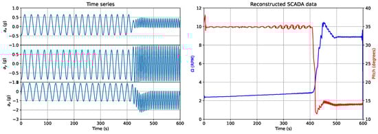 Considering now a single setup where varying operating conditions could be easily identified. For this particular setup, the 10 min resolution SCADA data registered a rotor angular velocity between 2.3 and 10.1, with a mean value of 4.3 RPM, and a pitch angle between −3.6 and 20.1, with a mean value of 13.6. After applying Equations (38) and (39), the full pitch and rotor angular velocity time series have been reconstructed as represented in Figure 8, where it should be recalled that the absolute value of the pitch value is not significant, only its variation. The distinct operation conditions are easily identifiable in the accelerations time series, and are also present in the reconstructed SCADA time series. The maximum and minimum values of the RPM are validated, the total pitch variation is validated and the mean RPM value is also confirmed.