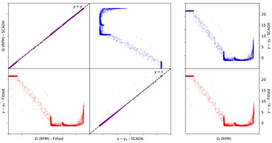 Finally, a full month of data has been analysed and the estimates for the mean value of the rotor angular velocity and pitch value compared with the SCADA ones. The results are plotted in Figure 9. It should be noted that the purpose of the representation used in Figure 9 is not only to allow for a visual inspection of the results based on the typical pitch against angular velocity curves, as can be seen on the right panel, but also to highlight that the predictions and measured quantities are indeed in very good agreement for arbitrary conditions. For this purpose, the left panel exhibits the same pitch-rpm curves, but oriented in such a way that the main diagonal plots, the top left and bottom right corners, can be used to compared directly predicted and measured quantities of interest. In these plots, the curves plotted in black dashed line indicates a perfect fit, and, as can be seen, the predictions closely match the registered values in the SCADA system, implying that both the expressions and the methodology are validated.