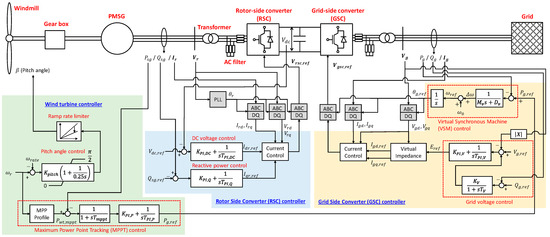Figure 1 shows the configuration of the WTG model used in the simulation, which is developed proprietary with [27,28] for the WTG model, MPPT, and pitch angle control. The wind turbine is connected to a permanent magnet synchronous generator (PMSG), and full-rated back-to-back converters are used to establish the grid connection. This is called a Type-IV or Type-D connection [27,28]. The converter on the WT side is designated as the rotor-side converter (RSC), and that on the other side is designated as the grid-side converter (GSC). The VSM is embedded in the GSC, and the RSC contributes to the DC-voltage regulation.