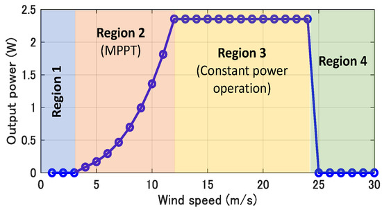 where ω r denotes the angular frequency of the wind turbine. Figure 2 depicts the operational point of the 2.5 MW-rated WTG, whose specifications are listed in Table 1. The WTG comprises four different regions of operation, as described in Section 1. In Region 2, the output increases with the increase in the wind speed since the wind energy also increases. In Region 3, the output is constant at the rated output of the WTG regardless of the wind speed.