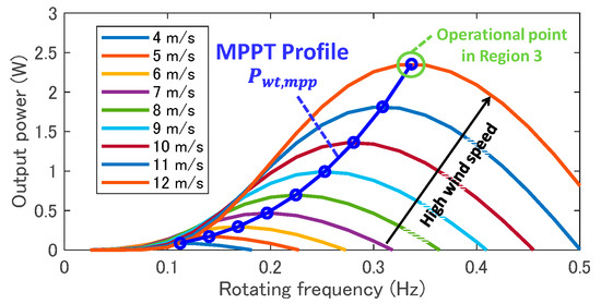 Figure 3 presents the power curves of the WTG based on the wind speed and MPPT profile, which is a trajectory of the maximum power point (MPP) at each wind speed. Here, the pitch angle, β , is zero to extract the maximum energy from the wind. The power curves are described based on (1), (2), and (3). The MPPT-profile curve can be derived by solving P w t / ω r = 0 . The tip speed ratio and power coefficient at the MPP, λ m p p and C p , m p p , are constant, regardless of the wind speed, and are given as follows:
