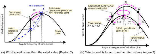 Figure 4b depicts the recovery process in Region 3. Assuming the same event described in Region 2, ω r and P w t are first decreased (A→B). The pitch angle control responds to the change and decreases the pitch angle, β , based on the logic shown in Figure 1, leading to the increase in P w t (B→C). The WT accelerates (C→D), and when ω r exceeds the rated value, ω r a t e , the pitch angle control increases β to decrease P w t (D→E) and decelerate WT (E→A). Since the pitch angle changes in conjunction with the rotating frequency of the WT, the locus of the operational point is expected to be close to a solid line, as shown in Figure 4b. The operational point returns to the initial point while describing the spiral if the pitch angle control responds quickly to the change in the rotating frequency of the WT.