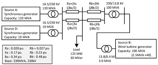 Figure 5 illustrates the three-machine system model, which was developed for this simulation. Source A represents a large-scale synchronous generator, Source D represents a small-scale generator that emulates the generator-trip event in the simulation, and Source B represents the WTG. The simulation is used to analyze the frequency regulating capability and the operation stability of the WTG with the embedded VSM (WTG-VSM) in the system where the WTG-VSM and synchronous generator coexist. The model was developed by using the least number of components possible to avoid the intervention of non-target elements [18,21,22,23]. The synchronous generator is based on Park’s model of the sixth order, and the control system comprises a speed governor and automatic voltage regulator (AVR) with a power system stabilizer (PSS) [31,32]. The total capacity of the system is 230 MVA, and the active power load is 125 MW. The rated capacity of the WTG is 100 MW, which is an integrated model of 40 WTGs connected in parallel, where each WTG has a rating of 2.5 MW. A Source D trip is a disturbance in this simulation, and the output of Source D is 5 MW, which is 4.0% of the load. The parameters of the synchronous generators, WTGs, and their controllers are listed in Appendix A.