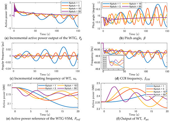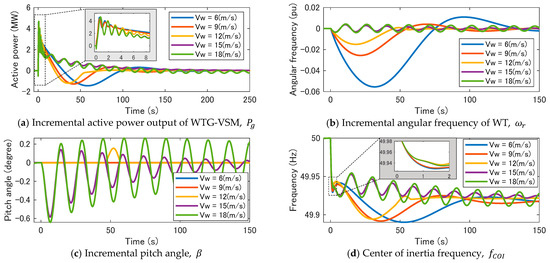 Figure 6 shows the simulation results using PSCAD/EMTDC, in which the wind speed is changed from 6 to 18 m/s, the MPPT time constant is 10 s, and the pitch angle control gain is 10. Figure 6a depicts the incremental active power of WTG-VSM, P g . After Source D trips at 0 s, P g quickly increases to cover the loss of generation like an inertial response of a synchronous generator, and there are no large differences in the inertial response produced by the wind speed. Subsequently, P g eventually returns to the initial value regardless of the wind speed because of the MPPT and pitch angle control, as explained in Section 3. The difference in the process of restoring the output to the initial value is caused by the difference in the properties of the operational regions. In Region 2, P g decreases beyond the initial value after the inertial response at approximately 50 s. This is because the MPPT decreases the power reference, P w t , m p p , in response to the change in the rotating frequency, ω r , as shown in Figure 6b. ω r recovers owing to the decrease in P g . The higher the wind speed, the smaller the frequency drop since the kinetic energy in the WT is larger at a higher wind speed. Conversely, in Region 3, P g gradually approaches the initial value without a large temporal drop. The pitch angle control quickly responds to the decrease in ω r , as shown in Figure 6c, and output of the WT P w t increases, which primarily helps to restore the operational state. P g rarely decreases owing to the MPPT in Region 3 since the response of the pitch angle control is remarkably quick.