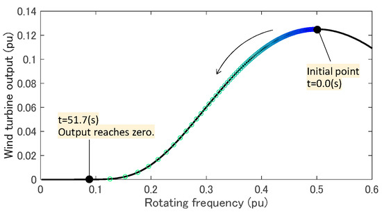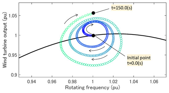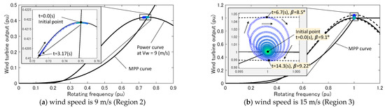 Figure 7 reveals the trajectory of the operational point of the WTG. At a low wind speed of 9 m/s, as shown in Figure 7a, the operational point drops along the power curve and subsequently returns to the initial point, as explained in Section 3, Figure 4a. At a high wind speed of 15 m/s, as shown in Figure 7b, the operational point converges to the initial point while describing a spiral, as explained in Section 3, Figure 4b. Thus, the behavior of the operational point in the recovery process is confirmed to be consistent with the assumption made in Section 3.