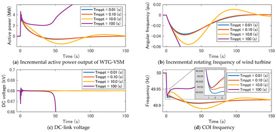 Figure 8d depicts the COI frequency, f C O I , and Table 4 lists the evaluation indices. The larger T m p p t leads the larger first local frequency nadir, f n a d L 1 , and RoCoF but not the lower frequency nadir, f n a d . Since the MPPT with a large T m p p t does not suppress the inertial response produced by the VSM within a short period, f n a d L 1 and RoCoF are improved as T m p p t becomes large. However, a large T m p p t causes a large drop in P g tens of seconds after the disturbance, which deteriorates f n a d . Thus, the lag component with time constant, T m p p t , presents a risk of loss of operation of the WTG even though the performance of the VSM in the transient state can be improved. The results of the simulation in the other parameter sets are shown in Figure A2 in Appendix B, and the same tendency can be observed for the change in T m p p t .