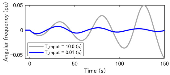 The MPPT essentially deteriorates the performance of the VSM since it recovers the output of the WT to the MPP after the VSM changes the WTG output. The VSM performance can be improved by increasing the time constant of the MPPT, which was already demonstrated in [19]. In this simulation, a wide range of the time constant was analyzed, and its influence on the operation stability of the WTG was evaluated. To the best of our knowledge, this has not been reported in previous studies.