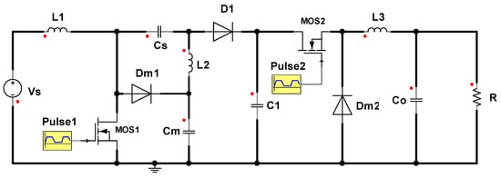 Figure 1 shows the basic structure of the new, modified, double-switch SEPIC-buck converter (DSSB). The DSSB may comprise a DC source (solar cell system), input smoothing inductor L1, power electronic switches MOS1 and MOS2, capacitive filters (Cs, Cm, C1, and Co), three freewheeling diodes (Dm1, Dm2, and Dm3), three smoothing inductors (L1, L2, and L3), and DC resistive load, R.